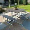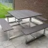 Stevige picknicktafel met een stalen frame, verzinkt en met Houtcomposiet planken. Deze vierkante picknicktafel heeft een omvang van 212 x 212 cm. Een echte aanwinst voor uw terras.  Deze picknicktafel is zeer geschikt om het hele jaar buiten te laten staan. De instap bij deze tafel zeer prettig, u hoeft de benen niet op te tillen. Gezien het duurzame, onderhoudsvrije en milieuvriendelijke karakter uitermate geschikt voor overheidsinstellingen en bedrijven. De tafel wordt altijd geheel gemonteerd geleverd, mits anders overeen gekomen.