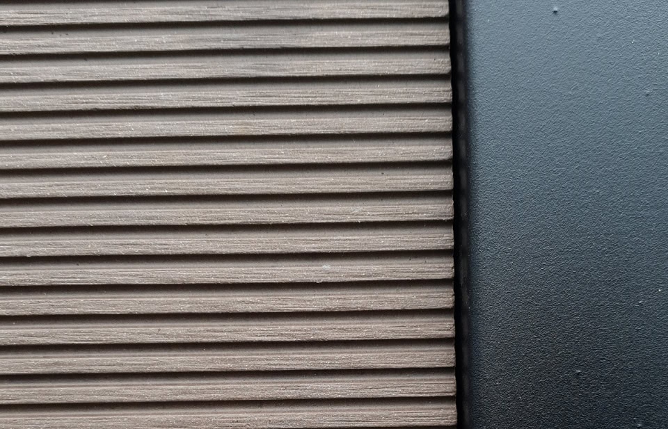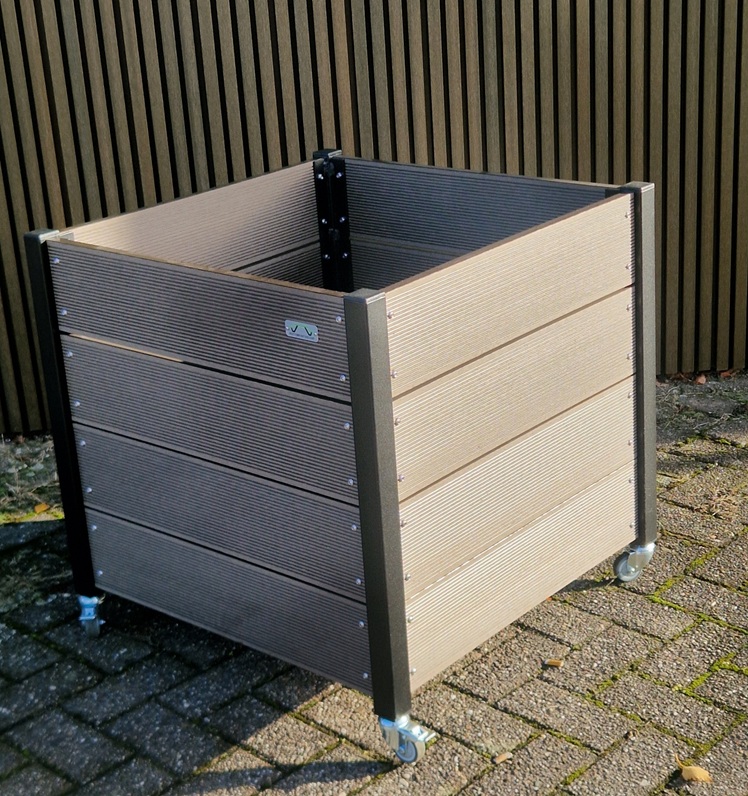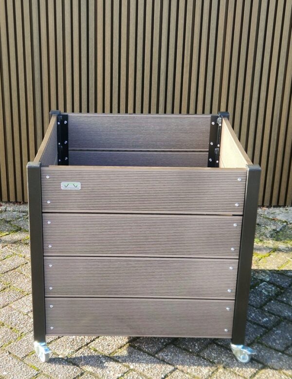Nieuwe plantenbak van houtcomposiet planken met zwarte hoeken.