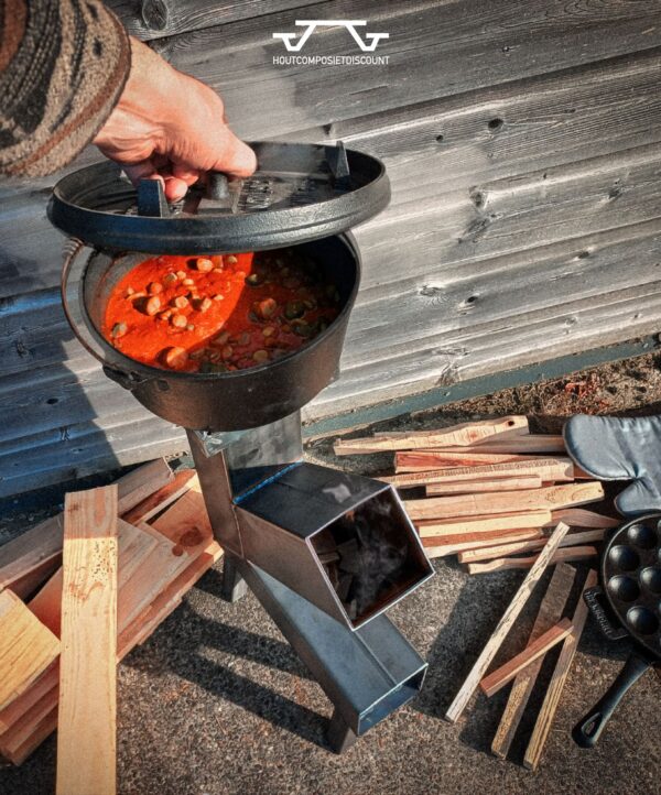 Deze rocket stove is natuurlijk heel leuk om kado te doen met de naderende feestdagen. Kinderen kunnen zelf uren lang poffertjes bakken of marchmallows roosteren. Zelf kan je er aangenaam warm bij zitten. Zelf een stoofpotje maken of een goed stuk vlees in de gietijzeren pan (dutch oven, bbq pan of skillet) kan ook prima op deze hout stoof.